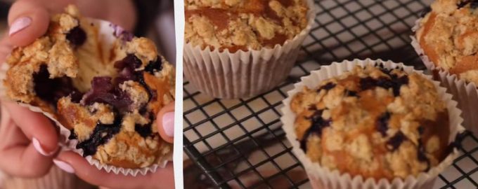 Rozgrzej piekarnik do 180℃. W misce dodać jajka, jogurt grecki, roztopione masło, mleko, biały i brązowy cukier. Ubijaj na niskich obrotach do uzyskania gładkiej masy. Przesiać mąkę, sól i proszek do pieczenia. Kontynuuj dokładne mieszanie, aż wszystkie składniki się połączą. Delikatnie wmieszaj jagody. Rozłóż ciasto do foremek. Wymieszaj wszystkie składniki na kruszonkę. Rozsyp kruszonkę na wierzchu ciasta w każdej foremce. Piec w piekarniku przez 20-25 minut.
