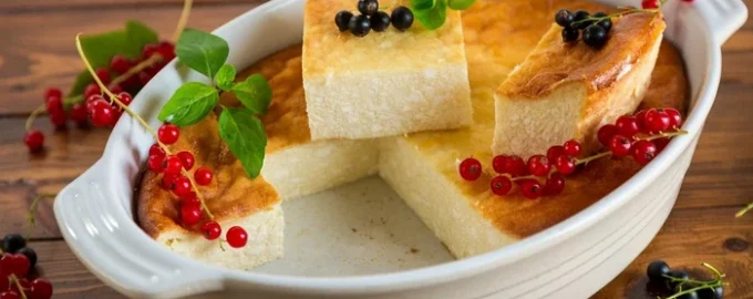 Zapiekanka twarogowa ze skrobią, gotowana bez mąki i kaszy manny, dzięki czemu jest lekka, delikatna i przewiewna. Podawać na śniadanie lub jako deser z kwaśną śmietaną, dżemem lub miodem.