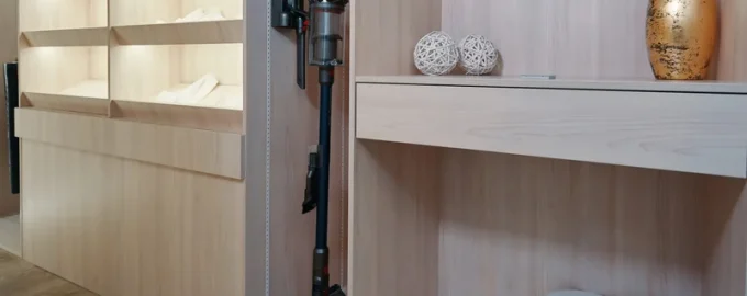 Jeśli w mieszkaniu znajdują się szafki lub wbudowane wnęki, można je wykorzystać do kompaktowego umieszczenia odkurzacza. Ważne jest, aby upewnić się, że urządzenie nie dotyka innych przedmiotów, aby zminimalizować ryzyko uszkodzenia obudowy i załączników.